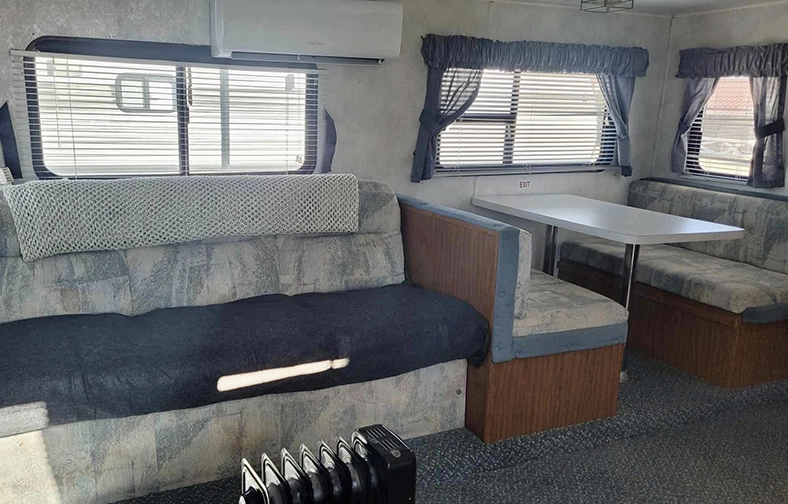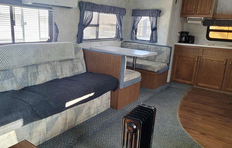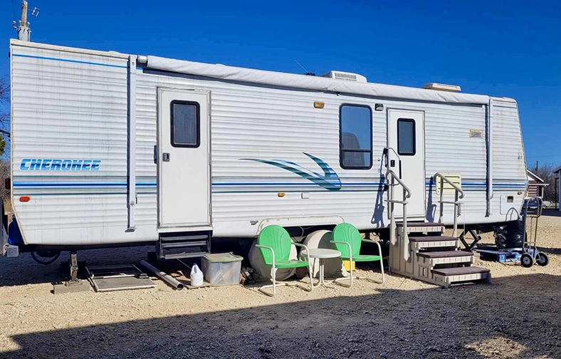 2000 Forest River Cherokee 29 ft with living room slide out. Full furnished kitchen with gas stove top and oven, microwave and refrigerator/freezer. We’ve supplied the unit with pots/pans, dish-ware and utensils. Comfortable dining space and couch can be pulled out to provide extra sleep space for an additional occupant. We’ll supply a memory foam topper and bedding for the pullout as needed. Upgraded comfortable queen sized mattress and fully functional restroom with shower. Two Smartv’s available with one mounted in the bedroom and another larger HDTV mounted in the living room. AC/Heat Mini split unit installed in the living room and the camper AC unit works as well.