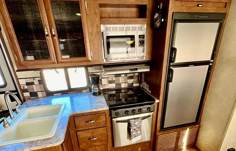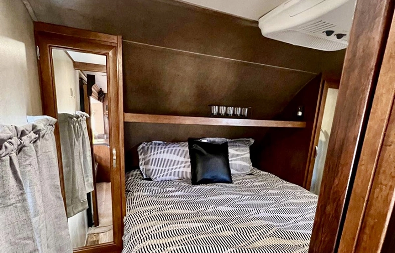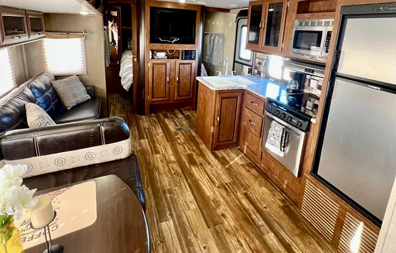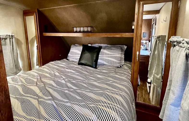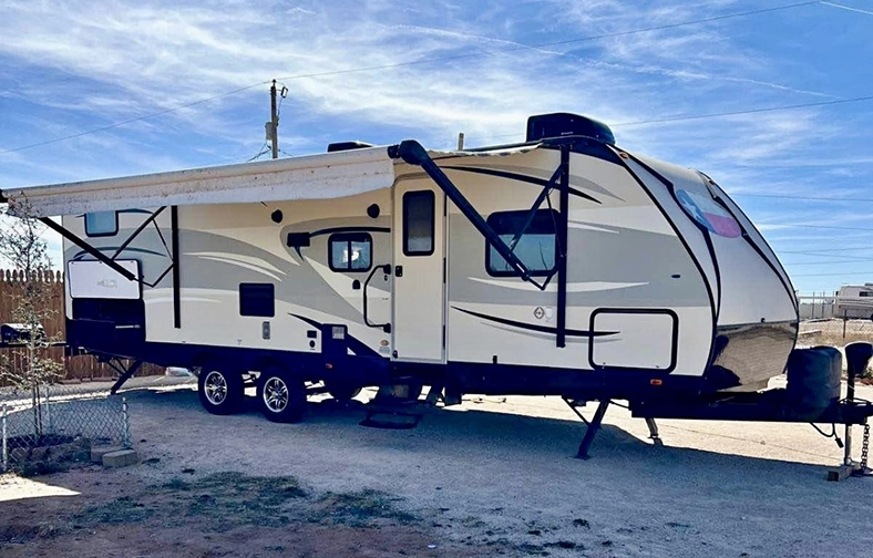 2016 Forest River Vibe 32 ft camper with new mattress, dual AC, fully stocked kitchen. Smartv and Directv cable provided as well. Access to WiFi and pay per use laundry facilities. Bunk beds available on the back side of the camper also and the couch folds down flat to also offer additional bedding options.