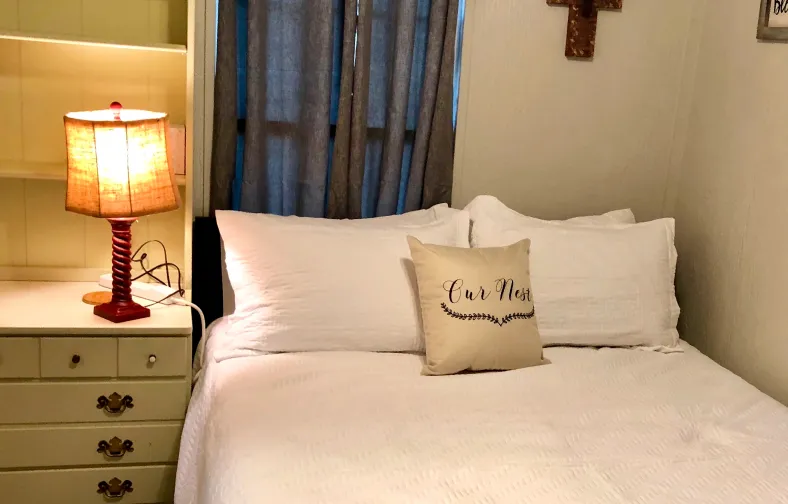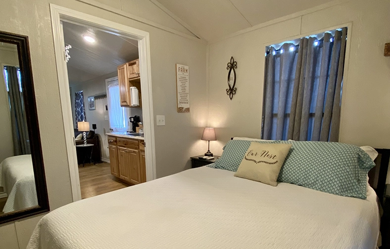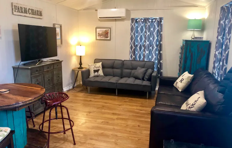 The Li’l Farmhouse offers cozy and comfortable accommodations for up to four guests. Sleeping accommodations include a queen sized bed in the bedroom, as well as a queen sleeper sofa and twin sized bed located within the living room area.