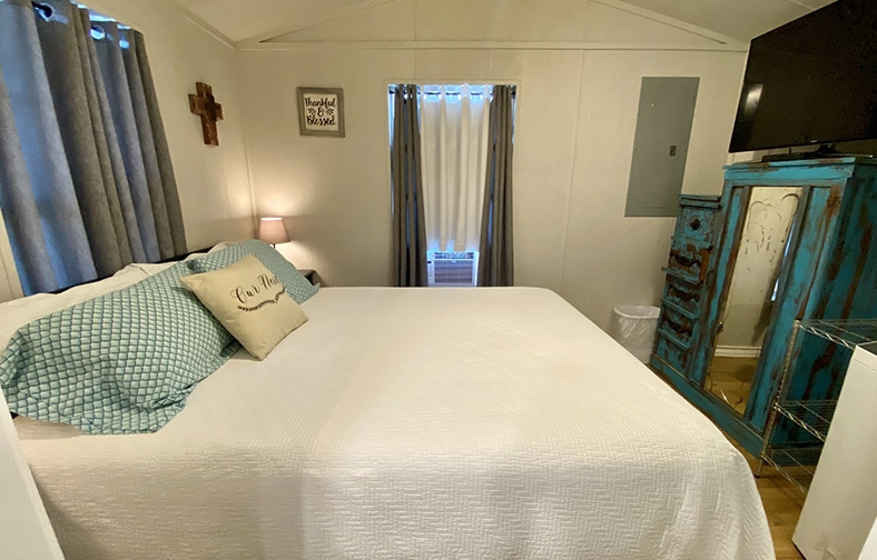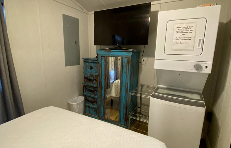 The Li’l Farmhouse includes a 3/4 bathroom, a small kitchen with four burner electric stove top and the kitchen is fully stocked with a side by side refrigerator with ice maker, dishware, utensils, glassware, pots and pans, large toaster oven as well as a small dining table and two flat panel Smart HDTV’s with satellite service available. High speed Wifi is complimentary to all guests residing at Vara Guest House.