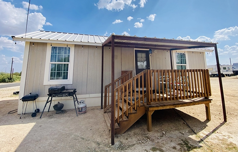The Li’l Farmhouse also features two AC window units and two oil filled electric space heaters, a stackable washer/dryer and an outdoor covered sitting area.